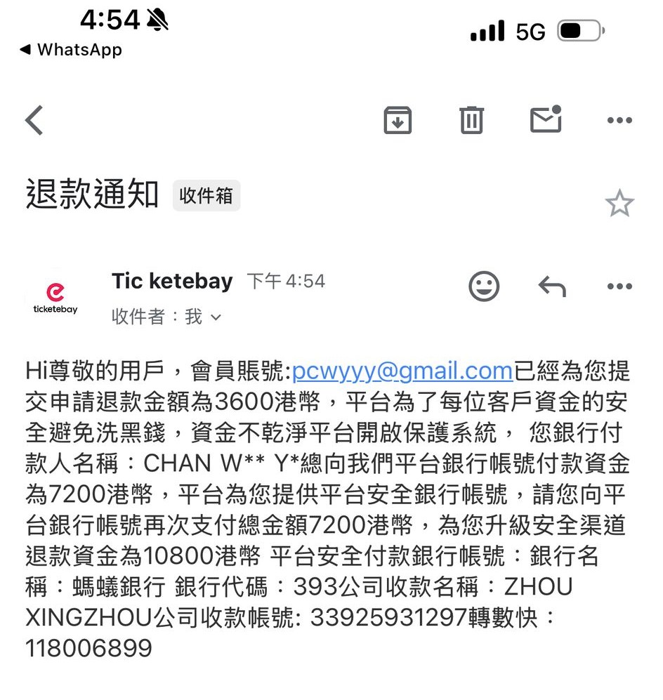1、假冒官方客服發送郵件,請認準ticketebay.com或者tixebay.com的官方郵件